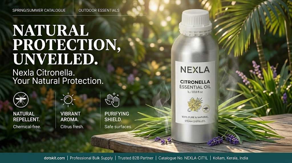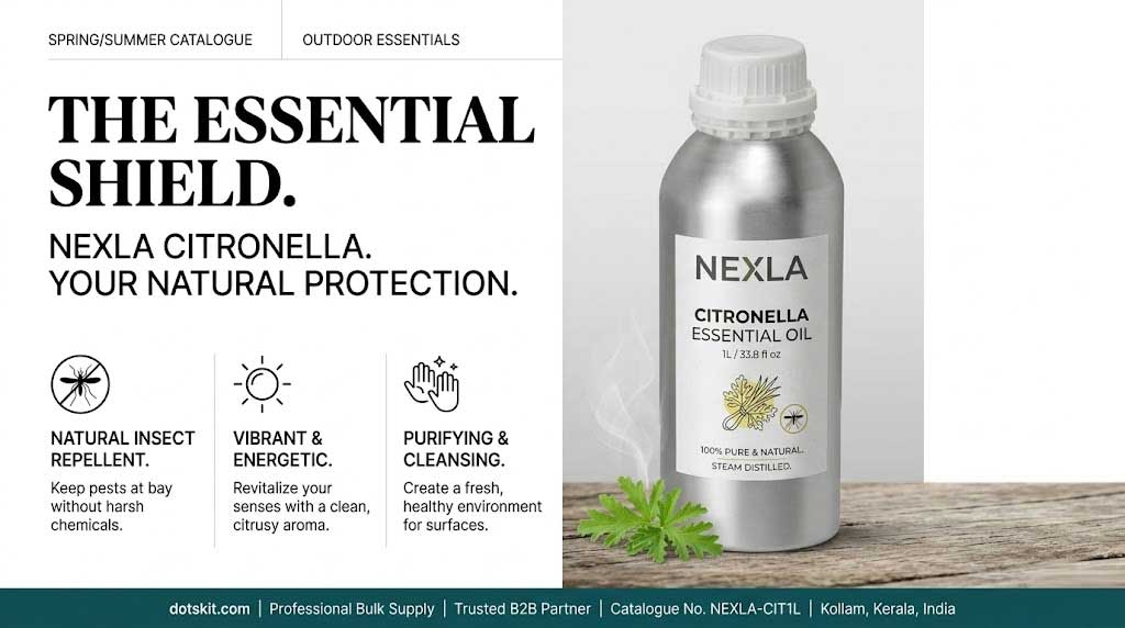 Many suppliers sell synthetic citronella fragrance oils or diluted blends marketed as essential oils. This citronella essential oil 1 litre is a verified 100% pure natural essential oil — not a fragrance oil, not a blend. This distinction is critical for manufacturers producing certified natural products, ECOCERT-compliant formulations, or Ayurvedic and herbal product lines where ingredient integrity must be documented. The natural oil contains the full spectrum of active phytochemicals including citronellal (30–45%), geraniol, and citronellol, which synthetic versions cannot replicate. For the best citronella essential oil for professional formulation, pure always outperforms synthetic.