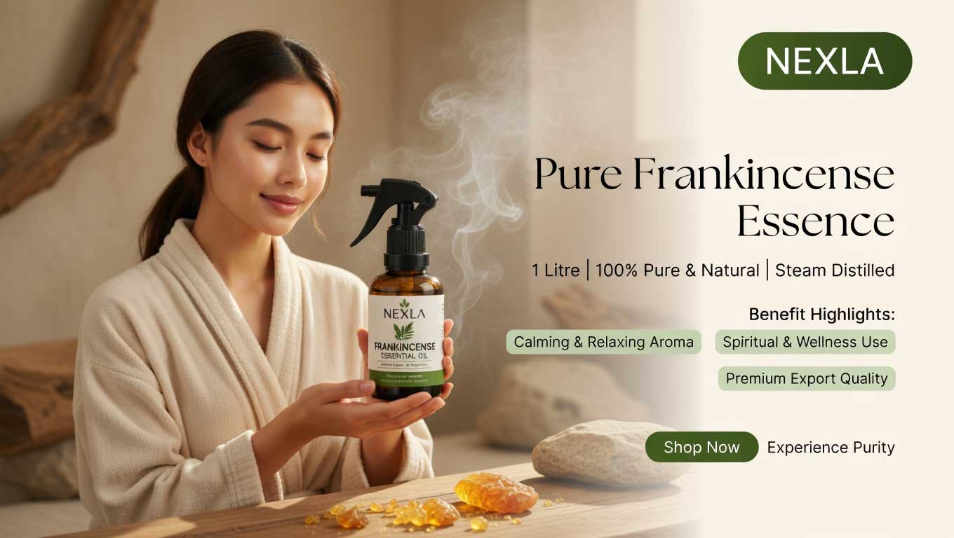 Frankincense Essential Oil 1 litre — 100% pure and natural essential oil steam-distilled from Boswellia serrata, sourced and processed in India. Premium aromatherapy, skincare, perfumery, and incense formulation oil.