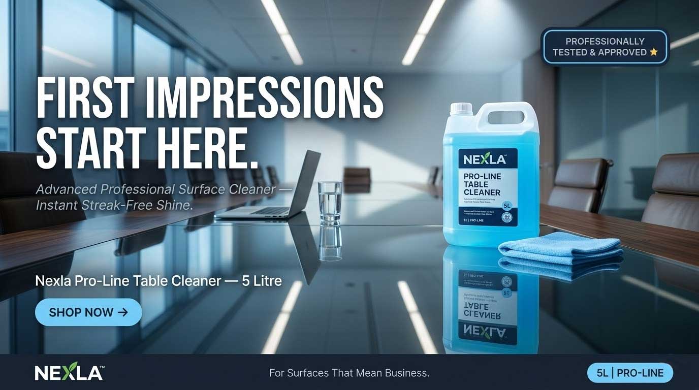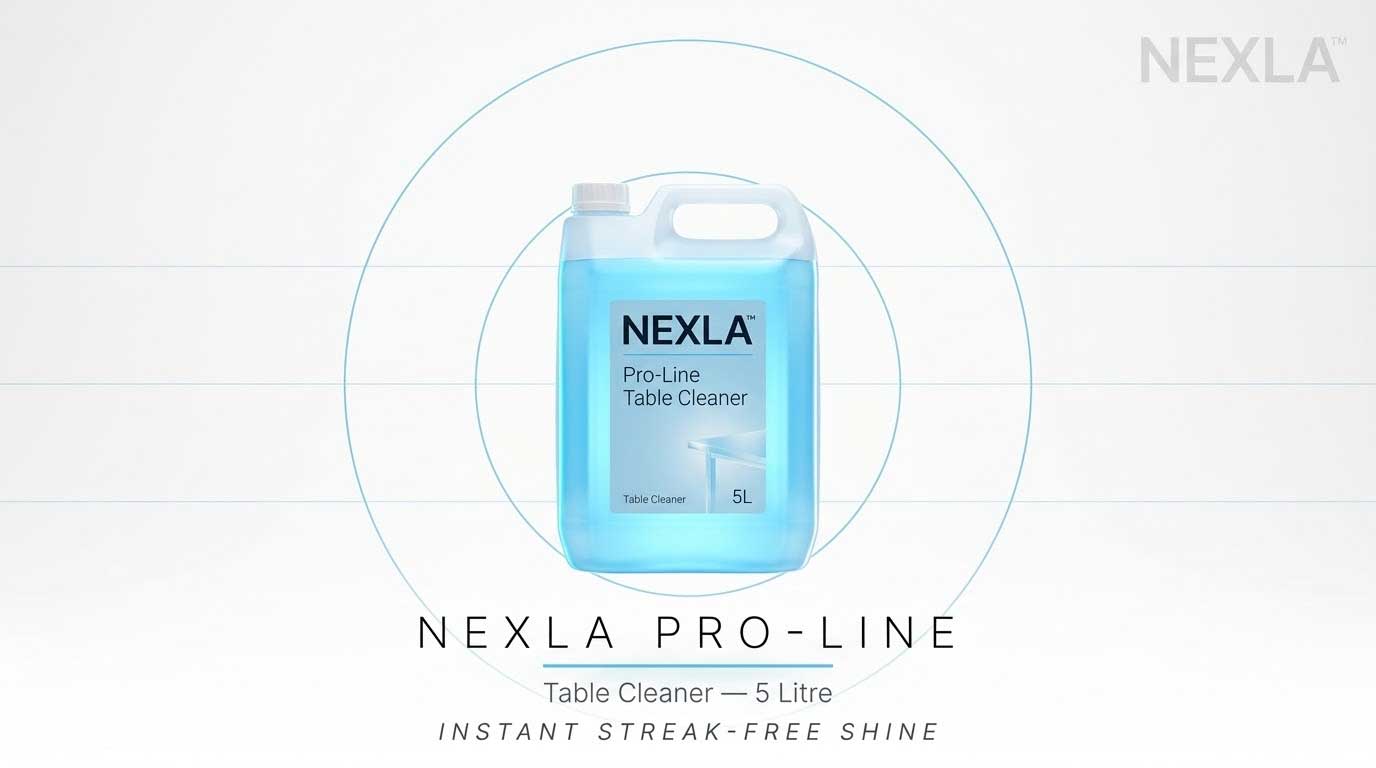 Most ordinary table cleaners leave a dull film or sticky residue after drying, requiring a second wipe to restore shine. Nexla D9 table cleaner 5 litre is formulated to clean and finish in one step — the active surface agents lift dirt and oils from the surface while the fast-dry base ensures zero streaking. For hospitality businesses and food service operators, this means faster table turnaround, less product waste, and consistently impressive surface presentation. When appearance and hygiene both matter, Nexla D9 is the best choice for professional table cleaning.