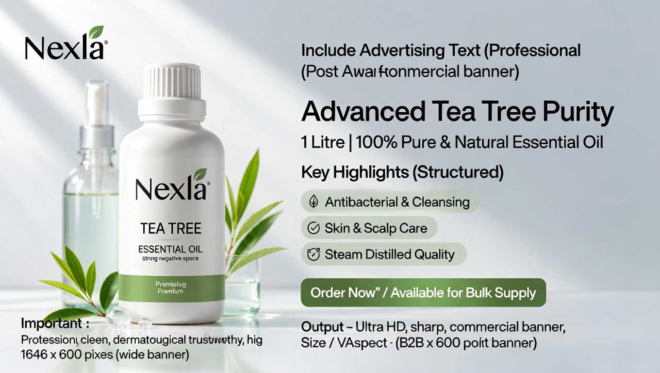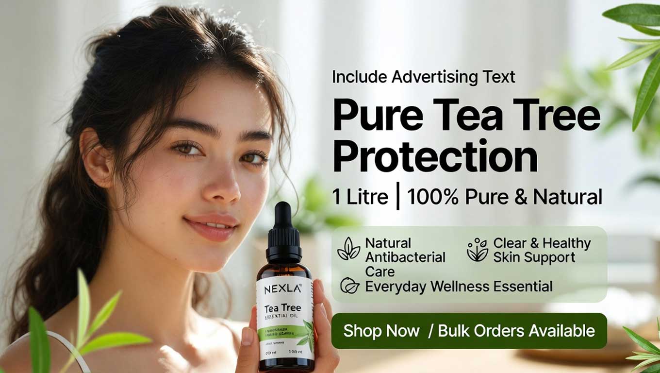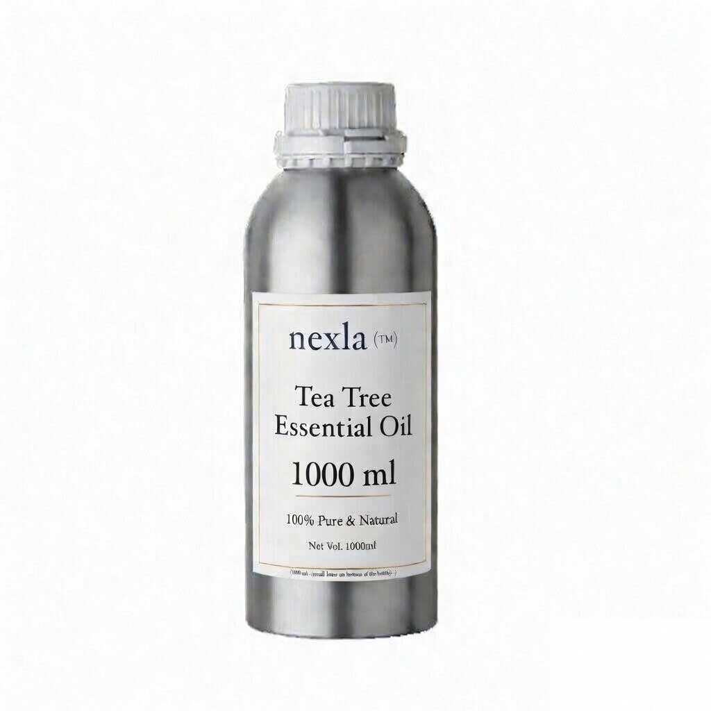 Tea Tree Essential Oil 1 litre — 100% pure and natural essential oil steam-distilled from Melaleuca alternifolia, sourced and processed in India. World’s leading antimicrobial essential oil — used in skincare, cleaning, and pharmaceuticals.